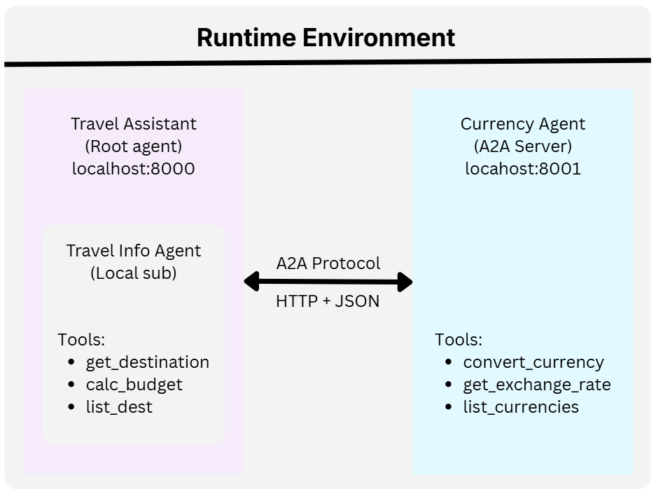 The root agent brings everything together. Its instruction set explains the available sub-agents and provides guidance on when to use each one. The sub_agents array includes both the local travel_info_agent and the remote currency_agent, and from the root agent’s perspective, they’re used in exactly the same way: