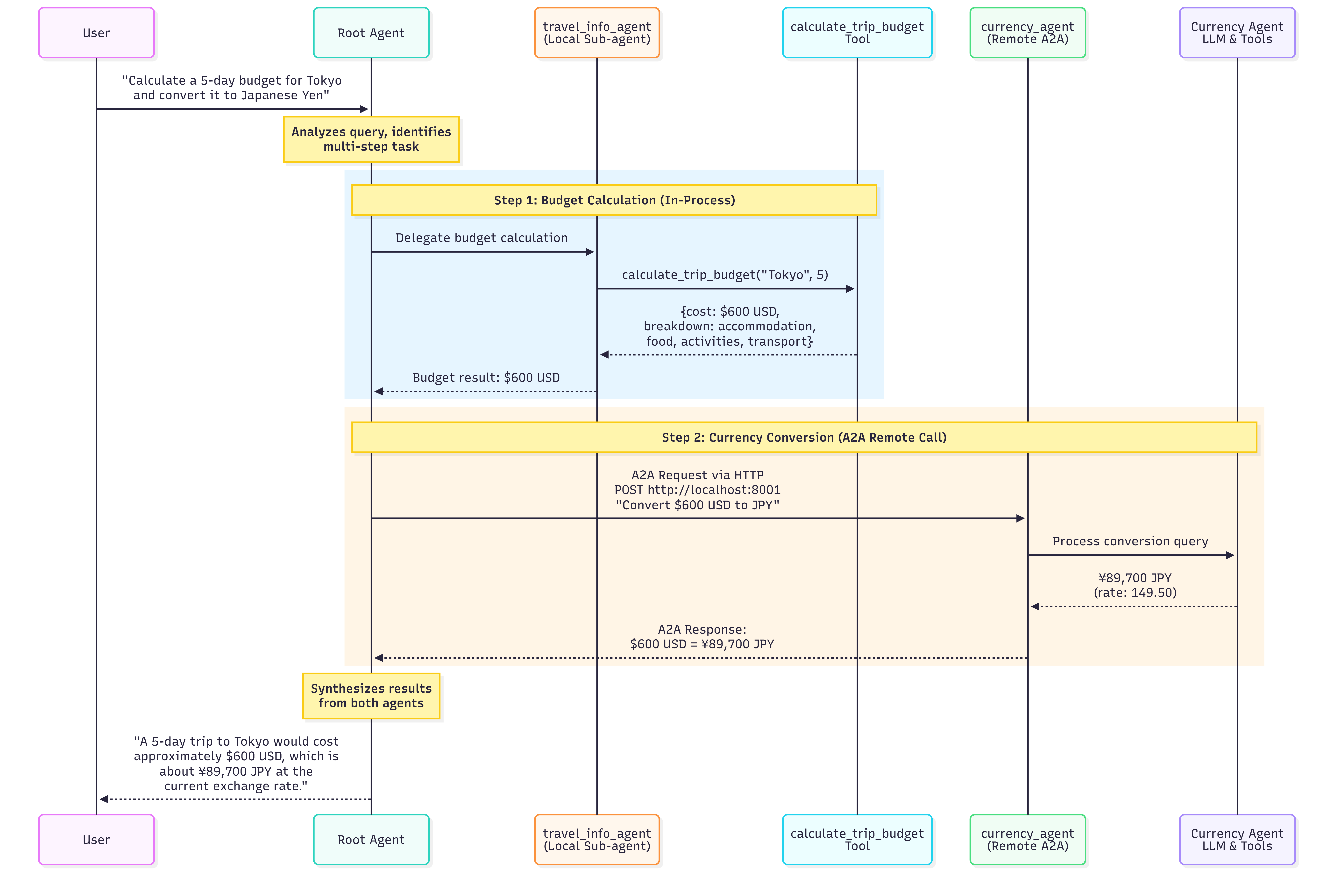 Let’s trace through what happens when a user asks the travel assistant to “Calculate a 5-day budget for Tokyo and convert it to Japanese Yen.” This query requires coordination between both agents and illustrates the full power of the A2A architecture.